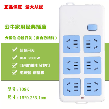公牛 其他電氣設(shè)備 插座無(wú)線多功能接線板電源六孔位GN-109K全長(zhǎng)3米