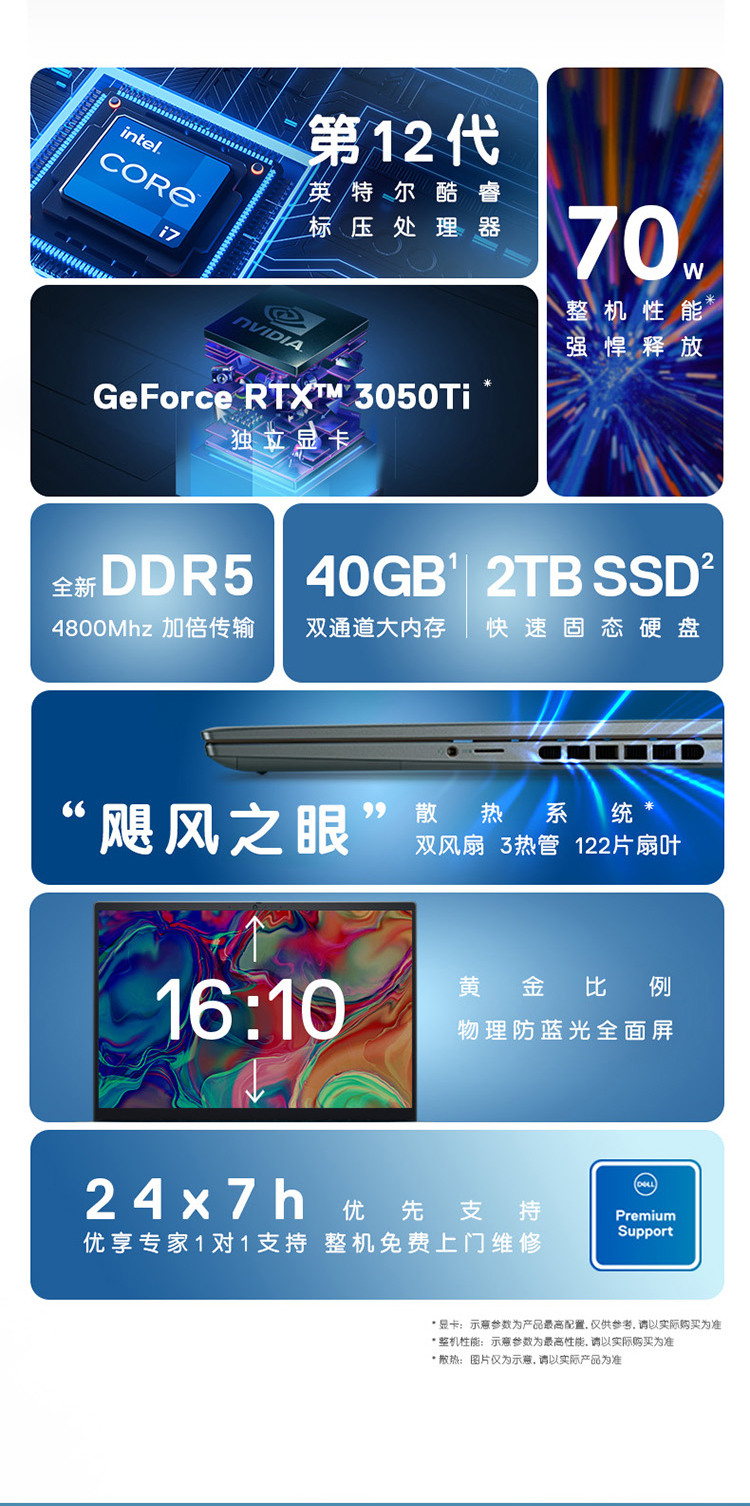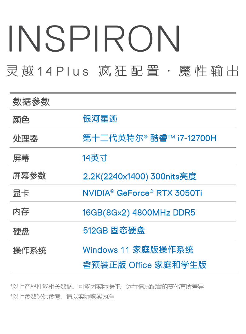 戴爾DELL 便攜式計算機 靈越14Plus 輕薄本設(shè)計本 12代i7-12700H 16G 512G 2.2K屏 RTX3050Ti