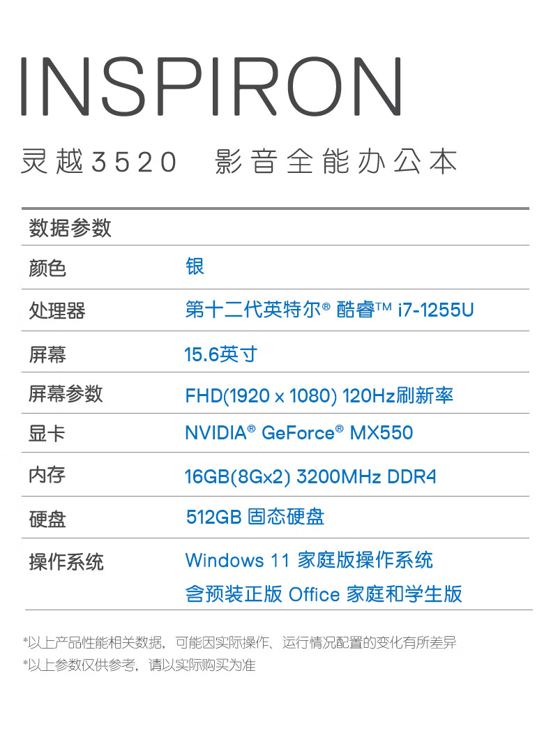 戴爾dell 便攜式計(jì)算機(jī) 靈越3520 15.6英寸高性能全面屏輕薄本(12代i7 16G 512G MX550 120Hz防眩光高刷屏)銀