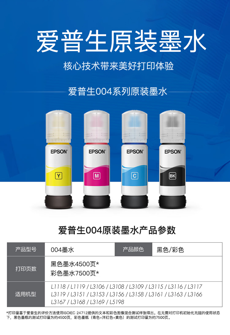 愛普生/EPSON 墨水/補(bǔ)充液/墨囊 004 適用L3153L3151L3251L3253L3118L3119L3158 T00U1-004黑 原裝 墨水
